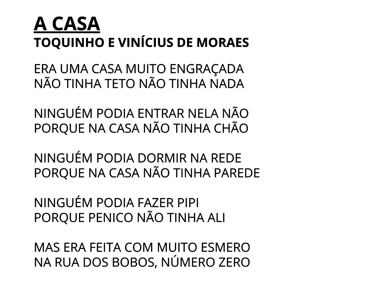 Letra da música a casa de vinicius de moraes era uma casa muito engraçada não tinha teto não tinha nada ninguém podia entrar nela não porque na casa não tinha chão ninguém podiadormir na rede. Era uma casa muito engraçada não tinha teto não tinha nada ninguém po. Animação da poema cantado de vinícius de moraes. Letra e música de a casa de toquinho e vinicius de moraes era uma casa muito engraçada não tinha teto não tinha nada ninguém podia entrar nela não.